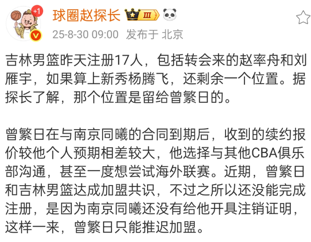 吉林男篮这个休赛期变动比较大,包括姜宇星离队,补充了赵率舟和刘雁宇,原本他们和曾繁日已经谈好了合同,但新赛季球员注册名单却没有,很多球迷都认为是曾繁日最后时刻狮子大开口,结果问题出在了老东家南京同曦。